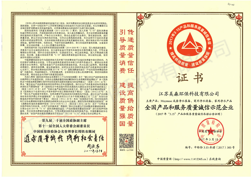 2017年全國產品和服務質量誠信示范企業-家用商用成套產品